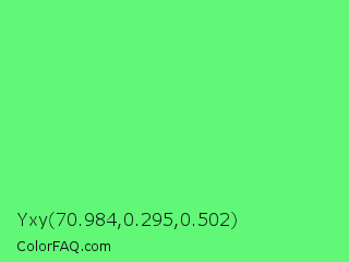 Yxy 70.984,0.295,0.502 Color is a light green color and the nearest color is Screamin Green #66ff66. Hex code #60f876 and RGB value is rgb(96,248,118). In RGB color space, this color is composed of 38% red, 97% green, 46% blue, In CMYK color space, this color is composed of 61% cyan, 0% magenta, 52% yellow , 3% black , In HSL color space, this color has a hue angle of 129° , 92% saturation and 67% lightness.