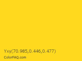 Yxy 70.985,0.446,0.477 Color is a normal yellow color and the nearest color is Candlelight #fcd917. Hex code #ffd91e and RGB value is rgb(255,217,30). In RGB color space, this color is composed of 100% red, 85% green, 12% blue, In CMYK color space, this color is composed of 0% cyan, 15% magenta, 88% yellow , 0% black , In HSL color space, this color has a hue angle of 50° , 100% saturation and 56% lightness.