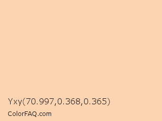 Yxy 70.997,0.368,0.365 Color is a very light orange color and the nearest color is Light Apricot #fdd5b1. Hex code #fcd4b2 and RGB value is rgb(252,212,178). In RGB color space, this color is composed of 99% red, 83% green, 70% blue, In CMYK color space, this color is composed of 0% cyan, 16% magenta, 29% yellow , 1% black , In HSL color space, this color has a hue angle of 28° , 93% saturation and 84% lightness.