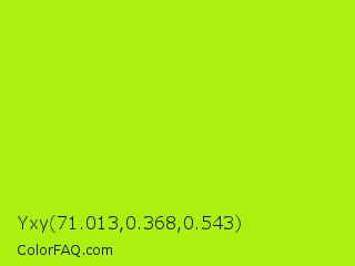 Yxy 71.013,0.368,0.543 Color is a normal lime color and the nearest color is Inch Worm #b0e313. Hex code #acf00f and RGB value is rgb(172,240,15). In RGB color space, this color is composed of 67% red, 94% green, 6% blue, In CMYK color space, this color is composed of 28% cyan, 0% magenta, 94% yellow , 6% black , In HSL color space, this color has a hue angle of 78° , 88% saturation and 50% lightness.