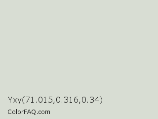 Yxy 71.015,0.316,0.34 Color is a very light green color and the nearest color is Westar #dcd9d2. Hex code #d8ddd3 and RGB value is rgb(216,221,211). In RGB color space, this color is composed of 85% red, 87% green, 83% blue, In CMYK color space, this color is composed of 2% cyan, 0% magenta, 5% yellow , 13% black , In HSL color space, this color has a hue angle of 90° , 13% saturation and 85% lightness.
