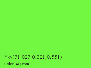 Yxy 71.027,0.321,0.551 Color is a light green color and the nearest color is Spring Frost #87ff2a. Hex code #72f841 and RGB value is rgb(114,248,65). In RGB color space, this color is composed of 45% red, 97% green, 25% blue, In CMYK color space, this color is composed of 54% cyan, 0% magenta, 74% yellow , 3% black , In HSL color space, this color has a hue angle of 104° , 93% saturation and 61% lightness.