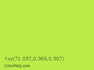 Yxy 71.037,0.369,0.507 Color is a light lime color and the nearest color is Conifer #acdd4d. Hex code #bbec49 and RGB value is rgb(187,236,73). In RGB color space, this color is composed of 73% red, 93% green, 29% blue, In CMYK color space, this color is composed of 21% cyan, 0% magenta, 69% yellow , 7% black , In HSL color space, this color has a hue angle of 78° , 81% saturation and 61% lightness.