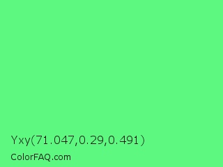 Yxy 71.047,0.29,0.491 Color is a light green color and the nearest color is Very Light Malachite Green #64e986. Hex code #5df87f and RGB value is rgb(93,248,127). In RGB color space, this color is composed of 36% red, 97% green, 50% blue, In CMYK color space, this color is composed of 63% cyan, 0% magenta, 49% yellow , 3% black , In HSL color space, this color has a hue angle of 133° , 92% saturation and 67% lightness.