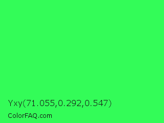 Yxy 71.055,0.292,0.547 Color is a normal green color and the nearest color is UFO Green #3cd070. Hex code #33fc58 and RGB value is rgb(51,252,88). In RGB color space, this color is composed of 20% red, 99% green, 35% blue, In CMYK color space, this color is composed of 80% cyan, 0% magenta, 65% yellow , 1% black , In HSL color space, this color has a hue angle of 131° , 97% saturation and 59% lightness.