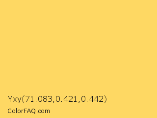 Yxy 71.083,0.421,0.442 Color is a light orange color and the nearest color is Goldenrod #fcd667. Hex code #fed863 and RGB value is rgb(254,216,99). In RGB color space, this color is composed of 100% red, 85% green, 39% blue, In CMYK color space, this color is composed of 0% cyan, 15% magenta, 61% yellow , 0% black , In HSL color space, this color has a hue angle of 45° , 99% saturation and 69% lightness.