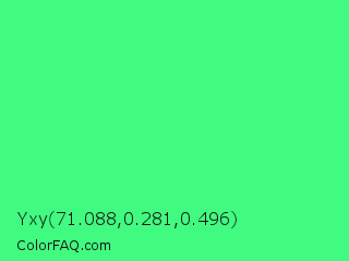 Yxy 71.088,0.281,0.496 Color is a light green color and the nearest color is Very Light Malachite Green #64e986. Hex code #41fa80 and RGB value is rgb(65,250,128). In RGB color space, this color is composed of 25% red, 98% green, 50% blue, In CMYK color space, this color is composed of 74% cyan, 0% magenta, 49% yellow , 2% black , In HSL color space, this color has a hue angle of 140° , 95% saturation and 62% lightness.