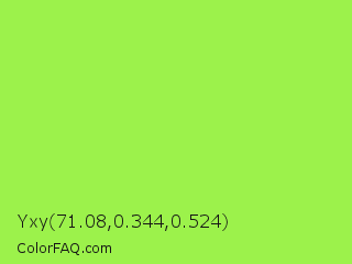 Yxy 71.08,0.344,0.524 Color is a light green color and the nearest color is French Lime #9efd38. Hex code #9cf24b and RGB value is rgb(156,242,75). In RGB color space, this color is composed of 61% red, 95% green, 29% blue, In CMYK color space, this color is composed of 36% cyan, 0% magenta, 69% yellow , 5% black , In HSL color space, this color has a hue angle of 91° , 87% saturation and 62% lightness.