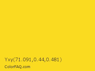 Yxy 71.091,0.44,0.481 Color is a normal yellow color and the nearest color is Ripe Lemon #f4d81c. Hex code #fadb20 and RGB value is rgb(250,219,32). In RGB color space, this color is composed of 98% red, 86% green, 13% blue, In CMYK color space, this color is composed of 0% cyan, 12% magenta, 87% yellow , 2% black , In HSL color space, this color has a hue angle of 51° , 96% saturation and 55% lightness.