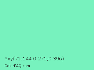 Yxy 71.144,0.271,0.396 Color is a light green color and the nearest color is Aquamarine #7fffd4. Hex code #77f2be and RGB value is rgb(119,242,190). In RGB color space, this color is composed of 47% red, 95% green, 75% blue, In CMYK color space, this color is composed of 51% cyan, 0% magenta, 21% yellow , 5% black , In HSL color space, this color has a hue angle of 155° , 83% saturation and 71% lightness.