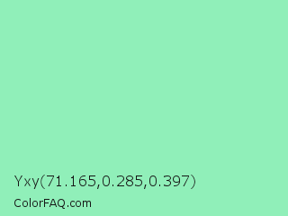 Yxy 71.165,0.285,0.397 Color is a light green color and the nearest color is Teal Deer #99e6b3. Hex code #90efb9 and RGB value is rgb(144,239,185). In RGB color space, this color is composed of 56% red, 94% green, 73% blue, In CMYK color space, this color is composed of 40% cyan, 0% magenta, 23% yellow , 6% black , In HSL color space, this color has a hue angle of 146° , 75% saturation and 75% lightness.