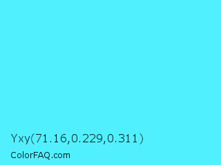 Yxy 71.16,0.229,0.311 Color is a light cyan color and the nearest color is Turquoise Blue #6cdae7. Hex code #50f0ff and RGB value is rgb(80,240,255). In RGB color space, this color is composed of 31% red, 94% green, 100% blue, In CMYK color space, this color is composed of 69% cyan, 6% magenta, 0% yellow , 0% black , In HSL color space, this color has a hue angle of 185° , 100% saturation and 66% lightness.
