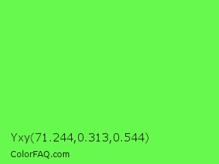 Yxy 71.244,0.313,0.544 Color is a light green color and the nearest color is Screamin Green #66ff66. Hex code #68f94e and RGB value is rgb(104,249,78). In RGB color space, this color is composed of 41% red, 98% green, 31% blue, In CMYK color space, this color is composed of 58% cyan, 0% magenta, 69% yellow , 2% black , In HSL color space, this color has a hue angle of 111° , 93% saturation and 64% lightness.
