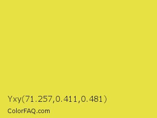 Yxy 71.257,0.411,0.481 Color is a normal yellow color and the nearest color is Sandstorm #ecd540. Hex code #e7e144 and RGB value is rgb(231,225,68). In RGB color space, this color is composed of 91% red, 88% green, 27% blue, In CMYK color space, this color is composed of 0% cyan, 3% magenta, 71% yellow , 9% black , In HSL color space, this color has a hue angle of 58° , 77% saturation and 59% lightness.