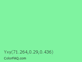 Yxy 71.264,0.29,0.436 Color is a light green color and the nearest color is Light Green #90ee90. Hex code #80f3a1 and RGB value is rgb(128,243,161). In RGB color space, this color is composed of 50% red, 95% green, 63% blue, In CMYK color space, this color is composed of 47% cyan, 0% magenta, 34% yellow , 5% black , In HSL color space, this color has a hue angle of 137° , 83% saturation and 73% lightness.