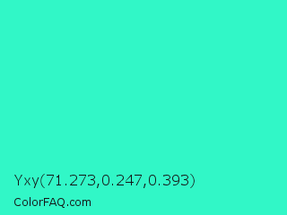 Yxy 71.273,0.247,0.393 Color is a normal cyan color and the nearest color is Turquoise #40e0d0. Hex code #31f7c7 and RGB value is rgb(49,247,199). In RGB color space, this color is composed of 19% red, 97% green, 78% blue, In CMYK color space, this color is composed of 80% cyan, 0% magenta, 19% yellow , 3% black , In HSL color space, this color has a hue angle of 165° , 93% saturation and 58% lightness.