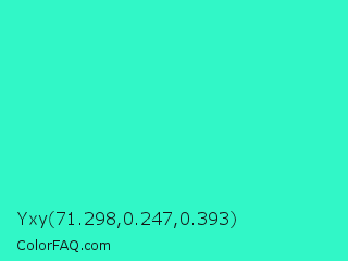 Yxy 71.298,0.247,0.393 Color is a normal cyan color and the nearest color is Turquoise #40e0d0. Hex code #31f7c7 and RGB value is rgb(49,247,199). In RGB color space, this color is composed of 19% red, 97% green, 78% blue, In CMYK color space, this color is composed of 80% cyan, 0% magenta, 19% yellow , 3% black , In HSL color space, this color has a hue angle of 165° , 93% saturation and 58% lightness.