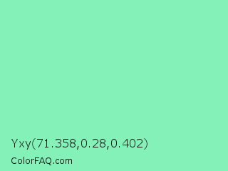 Yxy 71.358,0.28,0.402 Color is a light green color and the nearest color is Algae Green #93dfb8. Hex code #84f1b8 and RGB value is rgb(132,241,184). In RGB color space, this color is composed of 52% red, 95% green, 72% blue, In CMYK color space, this color is composed of 45% cyan, 0% magenta, 24% yellow , 5% black , In HSL color space, this color has a hue angle of 149° , 80% saturation and 73% lightness.