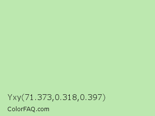Yxy 71.373,0.318,0.397 Color is a light green color and the nearest color is Celadon #ace1af. Hex code #bce8af and RGB value is rgb(188,232,175). In RGB color space, this color is composed of 74% red, 91% green, 69% blue, In CMYK color space, this color is composed of 19% cyan, 0% magenta, 25% yellow , 9% black , In HSL color space, this color has a hue angle of 106° , 55% saturation and 80% lightness.