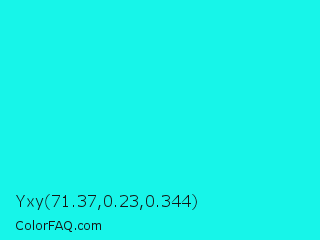 Yxy 71.37,0.23,0.344 Color is a normal cyan color and the nearest color is Loeen #15f2fd. Hex code #17f5e9 and RGB value is rgb(23,245,233). In RGB color space, this color is composed of 9% red, 96% green, 91% blue, In CMYK color space, this color is composed of 91% cyan, 0% magenta, 5% yellow , 4% black , In HSL color space, this color has a hue angle of 177° , 92% saturation and 53% lightness.