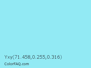 Yxy 71.458,0.255,0.316 Color is a light cyan color and the nearest color is Anakiwa #9de5ff. Hex code #92eaf5 and RGB value is rgb(146,234,245). In RGB color space, this color is composed of 57% red, 92% green, 96% blue, In CMYK color space, this color is composed of 40% cyan, 4% magenta, 0% yellow , 4% black , In HSL color space, this color has a hue angle of 187° , 83% saturation and 77% lightness.