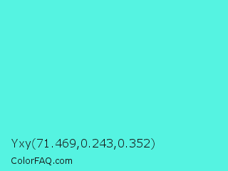 Yxy 71.469,0.243,0.352 Color is a light cyan color and the nearest color is Turquoise #40e0d0. Hex code #55f3e1 and RGB value is rgb(85,243,225). In RGB color space, this color is composed of 33% red, 95% green, 88% blue, In CMYK color space, this color is composed of 65% cyan, 0% magenta, 7% yellow , 5% black , In HSL color space, this color has a hue angle of 173° , 87% saturation and 64% lightness.
