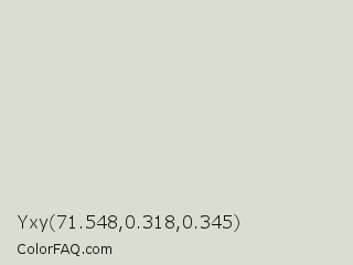 Yxy 71.548,0.318,0.345 Color is a very light green color and the nearest color is Moon Mist #dcddcc. Hex code #d8ded0 and RGB value is rgb(216,222,208). In RGB color space, this color is composed of 85% red, 87% green, 82% blue, In CMYK color space, this color is composed of 3% cyan, 0% magenta, 6% yellow , 13% black , In HSL color space, this color has a hue angle of 86° , 18% saturation and 84% lightness.