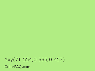 Yxy 71.554,0.335,0.457 Color is a light green color and the nearest color is Sulu #c1f07c. Hex code #b1ed83 and RGB value is rgb(177,237,131). In RGB color space, this color is composed of 69% red, 93% green, 51% blue, In CMYK color space, this color is composed of 25% cyan, 0% magenta, 45% yellow , 7% black , In HSL color space, this color has a hue angle of 94° , 75% saturation and 72% lightness.