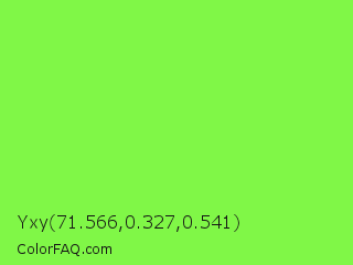 Yxy 71.566,0.327,0.541 Color is a light green color and the nearest color is Kiwi #8ee53f. Hex code #80f747 and RGB value is rgb(128,247,71). In RGB color space, this color is composed of 50% red, 97% green, 28% blue, In CMYK color space, this color is composed of 48% cyan, 0% magenta, 71% yellow , 3% black , In HSL color space, this color has a hue angle of 101° , 92% saturation and 62% lightness.