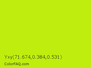 Yxy 71.674,0.384,0.531 Color is a normal lime color and the nearest color is Las Palmas #c6e610. Hex code #bfed0d and RGB value is rgb(191,237,13). In RGB color space, this color is composed of 75% red, 93% green, 5% blue, In CMYK color space, this color is composed of 19% cyan, 0% magenta, 95% yellow , 7% black , In HSL color space, this color has a hue angle of 72° , 90% saturation and 49% lightness.