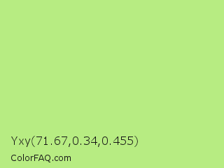 Yxy 71.67,0.34,0.455 Color is a light green color and the nearest color is Sulu #c1f07c. Hex code #b7ec82 and RGB value is rgb(183,236,130). In RGB color space, this color is composed of 72% red, 93% green, 51% blue, In CMYK color space, this color is composed of 22% cyan, 0% magenta, 45% yellow , 7% black , In HSL color space, this color has a hue angle of 90° , 74% saturation and 72% lightness.