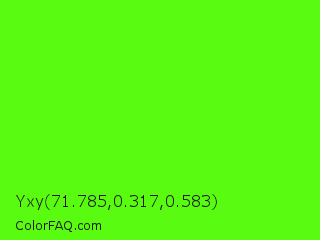 Yxy 71.785,0.317,0.583 Color is a normal green color and the nearest color is Bright Green #66ff00. Hex code #59fc11 and RGB value is rgb(89,252,17). In RGB color space, this color is composed of 35% red, 99% green, 7% blue, In CMYK color space, this color is composed of 65% cyan, 0% magenta, 93% yellow , 1% black , In HSL color space, this color has a hue angle of 102° , 98% saturation and 53% lightness.