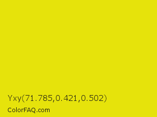 Yxy 71.785,0.421,0.502 Color is a normal yellow color and the nearest color is Peridot #e6e200. Hex code #e6e30b and RGB value is rgb(230,227,11). In RGB color space, this color is composed of 90% red, 89% green, 4% blue, In CMYK color space, this color is composed of 0% cyan, 1% magenta, 95% yellow , 10% black , In HSL color space, this color has a hue angle of 59° , 91% saturation and 47% lightness.