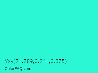 Yxy 71.789,0.241,0.375 Color is a normal cyan color and the nearest color is Turquoise #40e0d0. Hex code #2cf7d4 and RGB value is rgb(44,247,212). In RGB color space, this color is composed of 17% red, 97% green, 83% blue, In CMYK color space, this color is composed of 82% cyan, 0% magenta, 14% yellow , 3% black , In HSL color space, this color has a hue angle of 170° , 93% saturation and 57% lightness.