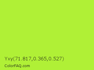 Yxy 71.817,0.365,0.527 Color is a normal green color and the nearest color is Green Lizard #a7f432. Hex code #b0f036 and RGB value is rgb(176,240,54). In RGB color space, this color is composed of 69% red, 94% green, 21% blue, In CMYK color space, this color is composed of 27% cyan, 0% magenta, 78% yellow , 6% black , In HSL color space, this color has a hue angle of 81° , 86% saturation and 58% lightness.