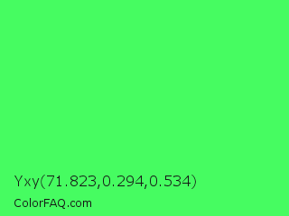 Yxy 71.823,0.294,0.534 Color is a light green color and the nearest color is Screamin Green #66ff66. Hex code #46fc61 and RGB value is rgb(70,252,97). In RGB color space, this color is composed of 27% red, 99% green, 38% blue, In CMYK color space, this color is composed of 72% cyan, 0% magenta, 62% yellow , 1% black , In HSL color space, this color has a hue angle of 129° , 97% saturation and 63% lightness.