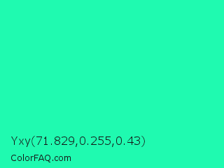 Yxy 71.829,0.255,0.43 Color is a normal green color and the nearest color is Medium Spring Green #00fa9a. Hex code #1ffab0 and RGB value is rgb(31,250,176). In RGB color space, this color is composed of 12% red, 98% green, 69% blue, In CMYK color space, this color is composed of 88% cyan, 0% magenta, 30% yellow , 2% black , In HSL color space, this color has a hue angle of 160° , 96% saturation and 55% lightness.