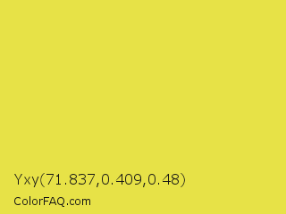Yxy 71.837,0.409,0.48 Color is a normal yellow color and the nearest color is Wattle #dcd747. Hex code #e7e247 and RGB value is rgb(231,226,71). In RGB color space, this color is composed of 91% red, 89% green, 28% blue, In CMYK color space, this color is composed of 0% cyan, 2% magenta, 69% yellow , 9% black , In HSL color space, this color has a hue angle of 58° , 77% saturation and 59% lightness.