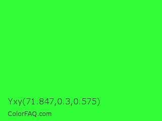 Yxy 71.847,0.3,0.575 Color is a normal green color and the nearest color is Neon Green #39ff14. Hex code #32fe38 and RGB value is rgb(50,254,56). In RGB color space, this color is composed of 20% red, 100% green, 22% blue, In CMYK color space, this color is composed of 80% cyan, 0% magenta, 78% yellow , 0% black , In HSL color space, this color has a hue angle of 122° , 99% saturation and 60% lightness.
