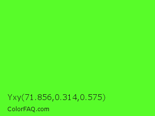 Yxy 71.856,0.314,0.575 Color is a normal green color and the nearest color is Neon Green #39ff14. Hex code #58fc29 and RGB value is rgb(88,252,41). In RGB color space, this color is composed of 35% red, 99% green, 16% blue, In CMYK color space, this color is composed of 65% cyan, 0% magenta, 84% yellow , 1% black , In HSL color space, this color has a hue angle of 107° , 97% saturation and 57% lightness.