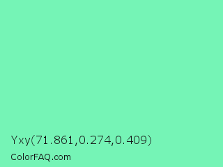Yxy 71.861,0.274,0.409 Color is a light green color and the nearest color is Medium Aquamarine #66ddaa. Hex code #75f4b6 and RGB value is rgb(117,244,182). In RGB color space, this color is composed of 46% red, 96% green, 71% blue, In CMYK color space, this color is composed of 52% cyan, 0% magenta, 25% yellow , 4% black , In HSL color space, this color has a hue angle of 151° , 85% saturation and 71% lightness.