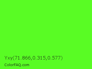Yxy 71.866,0.315,0.577 Color is a normal green color and the nearest color is Neon Green #39ff14. Hex code #59fc24 and RGB value is rgb(89,252,36). In RGB color space, this color is composed of 35% red, 99% green, 14% blue, In CMYK color space, this color is composed of 65% cyan, 0% magenta, 86% yellow , 1% black , In HSL color space, this color has a hue angle of 105° , 97% saturation and 56% lightness.