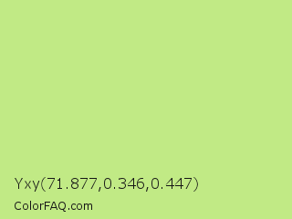 Yxy 71.877,0.346,0.447 Color is a light green color and the nearest color is Sulu #c1f07c. Hex code #c1ea85 and RGB value is rgb(193,234,133). In RGB color space, this color is composed of 76% red, 92% green, 52% blue, In CMYK color space, this color is composed of 18% cyan, 0% magenta, 43% yellow , 8% black , In HSL color space, this color has a hue angle of 84° , 71% saturation and 72% lightness.