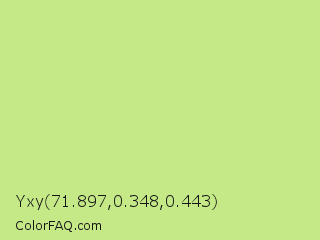 Yxy 71.897,0.348,0.443 Color is a light green color and the nearest color is Medium Spring Bud #c9dc87. Hex code #c5e987 and RGB value is rgb(197,233,135). In RGB color space, this color is composed of 77% red, 91% green, 53% blue, In CMYK color space, this color is composed of 15% cyan, 0% magenta, 42% yellow , 9% black , In HSL color space, this color has a hue angle of 82° , 69% saturation and 72% lightness.