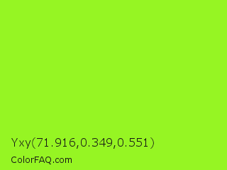 Yxy 71.916,0.349,0.551 Color is a normal green color and the nearest color is Spring Frost #87ff2a. Hex code #96f523 and RGB value is rgb(150,245,35). In RGB color space, this color is composed of 59% red, 96% green, 14% blue, In CMYK color space, this color is composed of 39% cyan, 0% magenta, 86% yellow , 4% black , In HSL color space, this color has a hue angle of 87° , 91% saturation and 55% lightness.