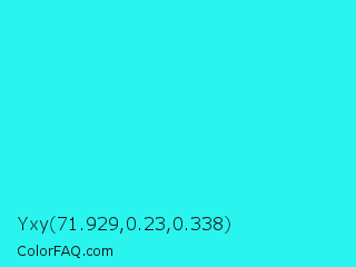 Yxy 71.929,0.23,0.338 Color is a normal cyan color and the nearest color is Loeen #15f2fd. Hex code #29f5ee and RGB value is rgb(41,245,238). In RGB color space, this color is composed of 16% red, 96% green, 93% blue, In CMYK color space, this color is composed of 83% cyan, 0% magenta, 3% yellow , 4% black , In HSL color space, this color has a hue angle of 178° , 91% saturation and 56% lightness.