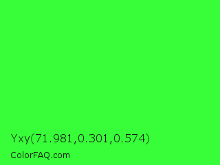 Yxy 71.981,0.301,0.574 Color is a light green color and the nearest color is Neon Green #39ff14. Hex code #37fe38 and RGB value is rgb(55,254,56). In RGB color space, this color is composed of 22% red, 100% green, 22% blue, In CMYK color space, this color is composed of 78% cyan, 0% magenta, 78% yellow , 0% black , In HSL color space, this color has a hue angle of 120° , 99% saturation and 61% lightness.