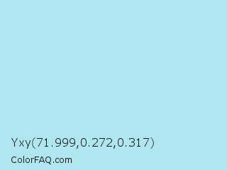 Yxy 71.999,0.272,0.317 Color is a very light cyan color and the nearest color is Blizzard Blue #ace5ee. Hex code #afe6f0 and RGB value is rgb(175,230,240). In RGB color space, this color is composed of 69% red, 90% green, 94% blue, In CMYK color space, this color is composed of 27% cyan, 4% magenta, 0% yellow , 6% black , In HSL color space, this color has a hue angle of 189° , 68% saturation and 81% lightness.