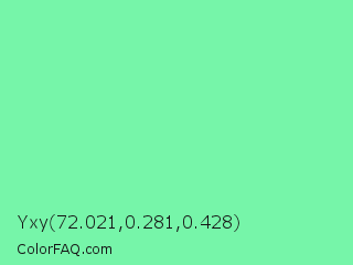 Yxy 72.021,0.281,0.428 Color is a light green color and the nearest color is Medium Aquamarine #66ddaa. Hex code #76f5a9 and RGB value is rgb(118,245,169). In RGB color space, this color is composed of 46% red, 96% green, 66% blue, In CMYK color space, this color is composed of 52% cyan, 0% magenta, 31% yellow , 4% black , In HSL color space, this color has a hue angle of 144° , 86% saturation and 71% lightness.