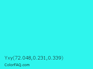 Yxy 72.048,0.231,0.339 Color is a normal cyan color and the nearest color is Loeen #15f2fd. Hex code #2ef5ed and RGB value is rgb(46,245,237). In RGB color space, this color is composed of 18% red, 96% green, 93% blue, In CMYK color space, this color is composed of 81% cyan, 0% magenta, 3% yellow , 4% black , In HSL color space, this color has a hue angle of 178° , 91% saturation and 57% lightness.